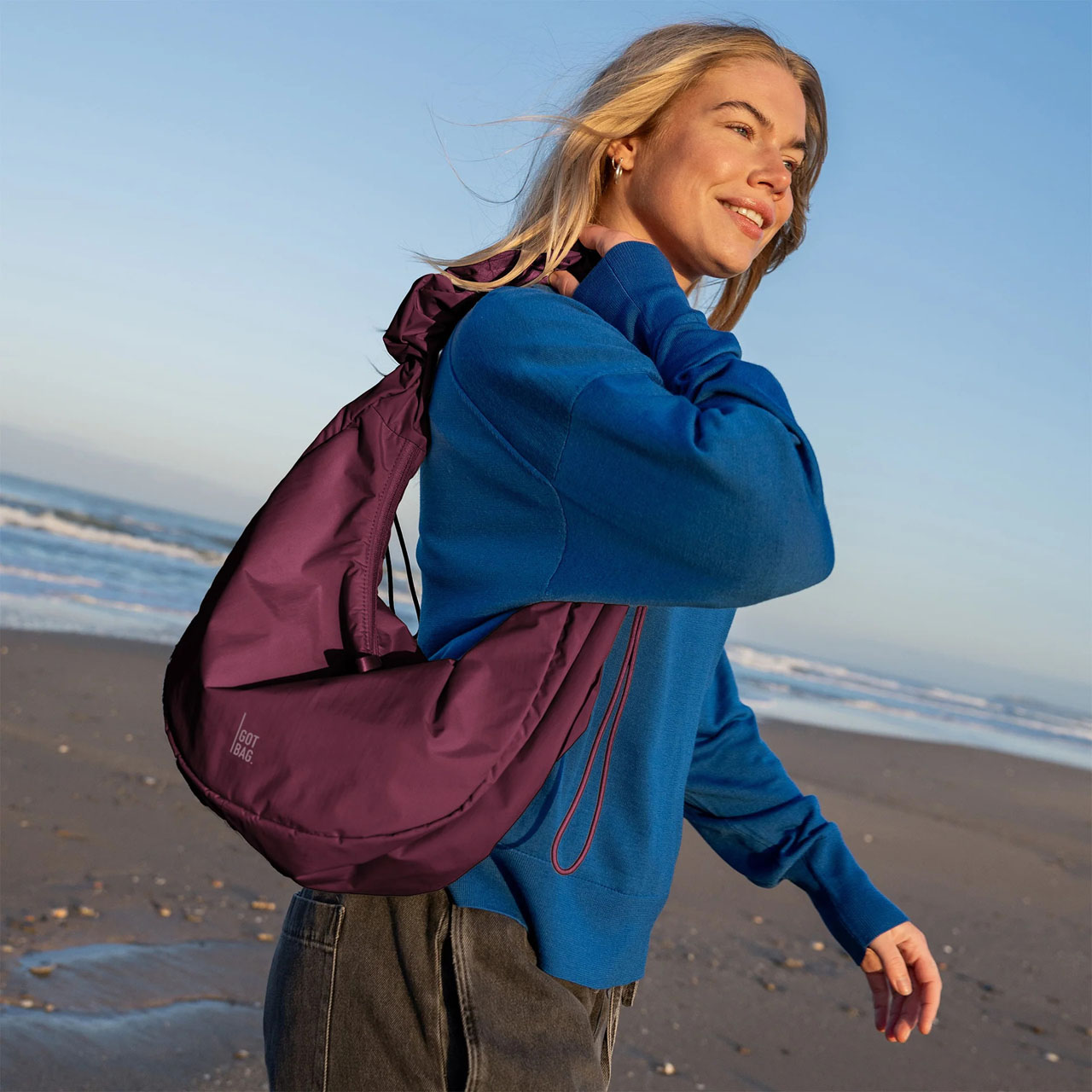 Ultraleicht und geräumig – die MOON BAG RUFFLE in kraken (bordeaux) ist für diejenigen entworfen, die Wert auf Style und Vielseitigkeit legen. Hergestellt aus super leichtem, recyceltem Nylon aus Fischernetzen, kombiniert sie modernes Design mit alltäglicher Funktionalität. Der verstellbare Riemen bietet vielseitige Tragemöglichkeiten: Trage sie als Umhängetasche mit dem flachen Riemen oder als Schultertasche, indem Du die Kordeln entlang des Riemens ziehst. Ihr großes Volumen bietet reichlich Platz für all Deine Essentials, und die Innentasche mit Reißverschluss sorgt dafür, dass alles organisiert bleibt.