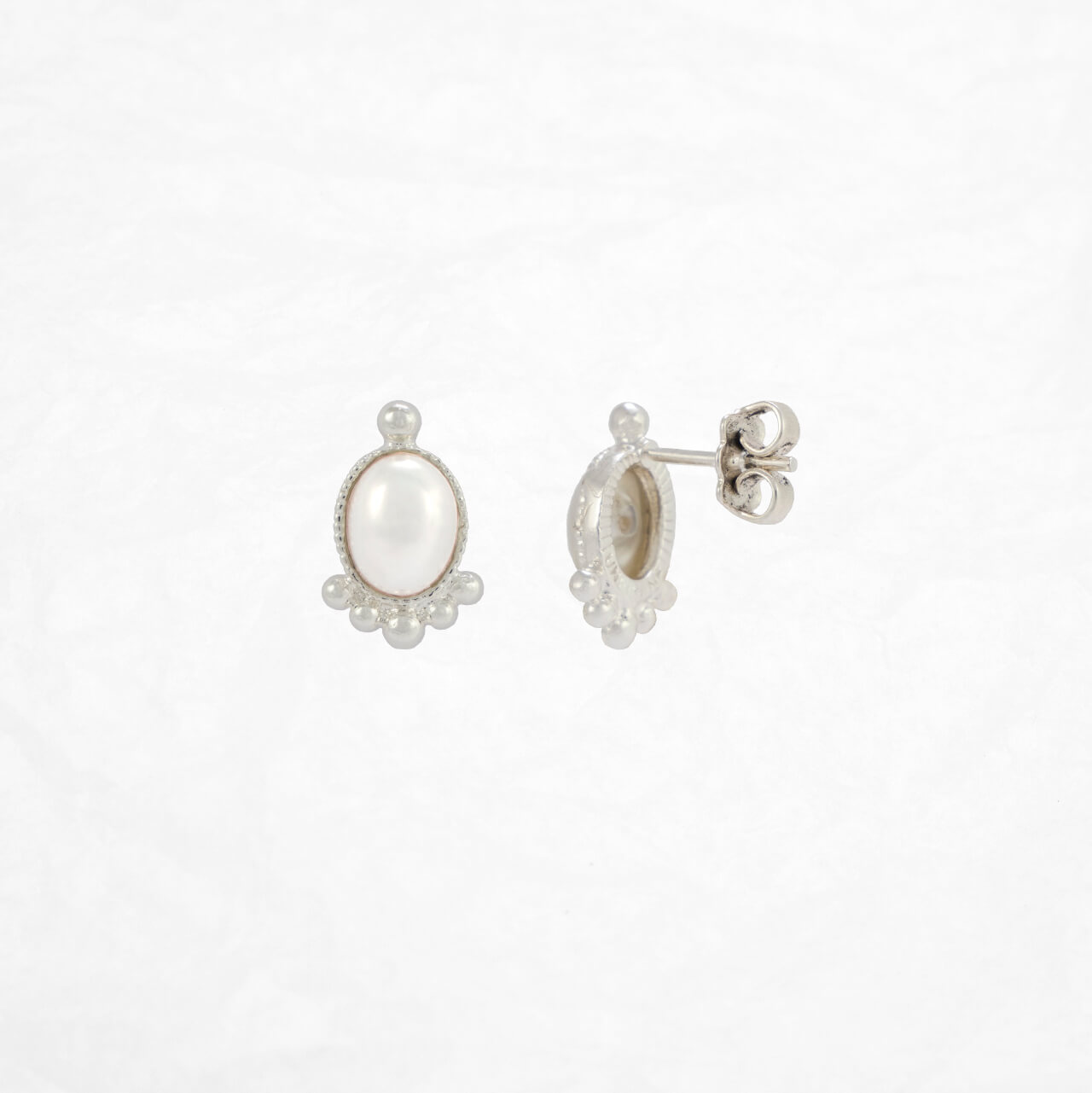 Herzige, klassische Ohrstecker von Une Ligne: Der ovale Swarovski-Stein in pearl ist in eine versilberte Fassung mit einem feinen Rand eingebaut. Unterhalb des Steins sind fünf kleine Kugeln angebracht, welche das elegante Bild vervollständigen. Der Stein hat die Masse 6x8mm, mit dem Rand 9x13mm. Die Versilberung in 925 Sterling Silber ist in 3 Mikron galvanisch auf den nickelfreien Buntmetallkörper aufgetragen.