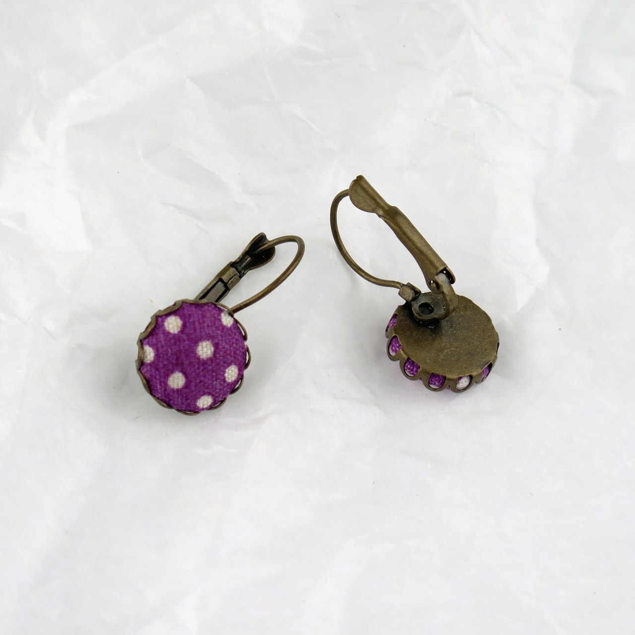 Ohrring mit Stoff-Cabochon in lila mit weissen Punkten, Fassung aus nickelfreiem Messing bronzefarben. Durchmesser Motiv inkl. Rand 14mm