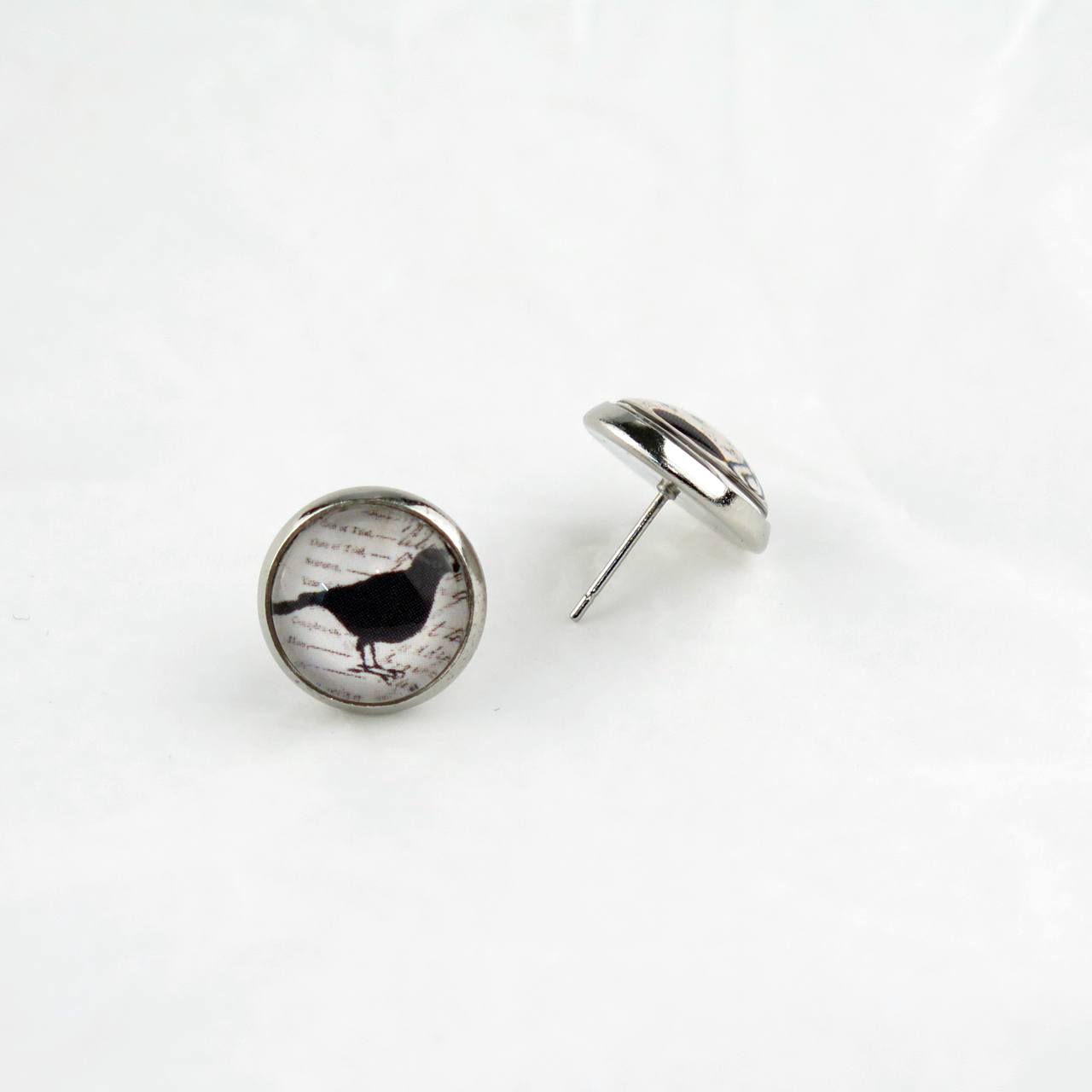 Ohrstecker mit Glas-Cabochon mit schwarzer Spatzen-Silhouette vor beschriftetem Hintergrund, Fassung aus nickelfreiem Messing silberfarben. Durchmesser Motiv inkl. Rand 14mm