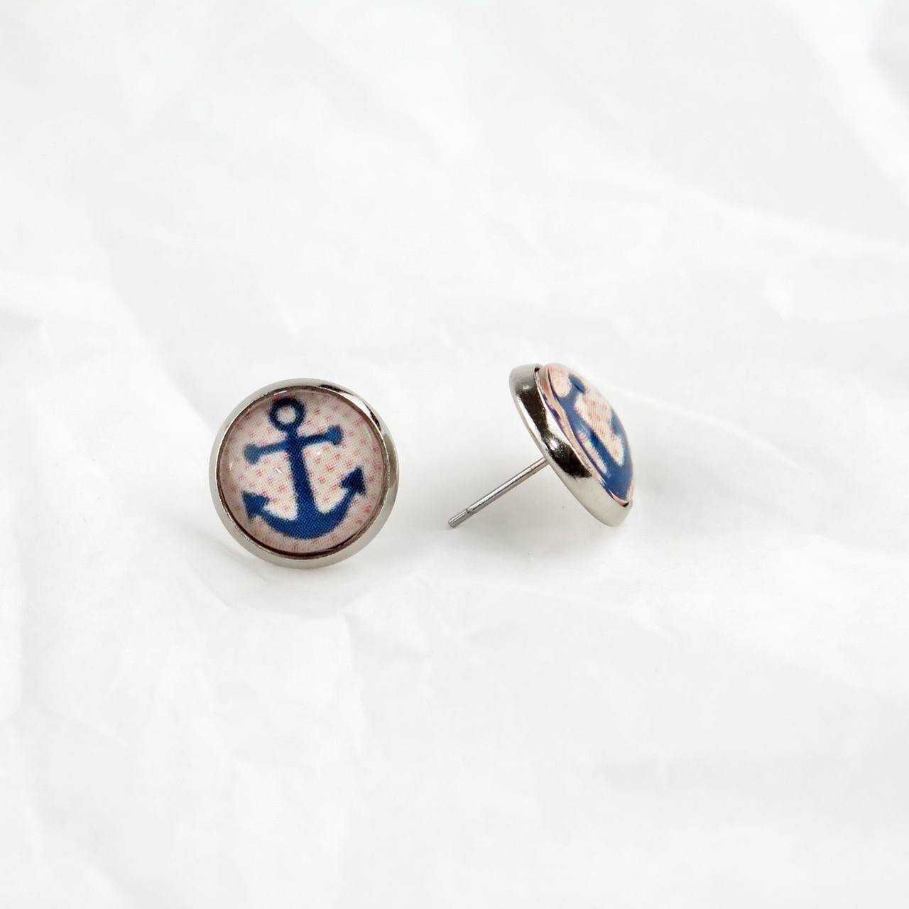Ohrstecker mit Glas-Cabochon mit blauem Anker vor rot gepunktetem Hintergrund, Fassung aus nickelfreiem Messing silberfarben. Durchmesser Motiv inkl. Rand 14mm